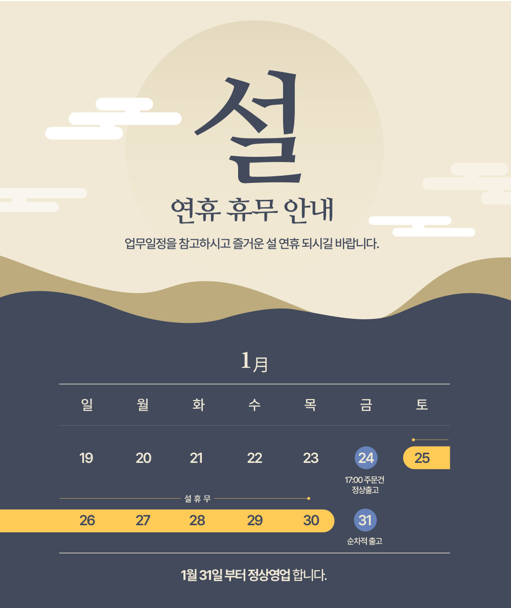이후 주문건은 설 연휴가 끝나고 1/31(금) 순차적으로 일괄 배송됨을 알려드립니다.